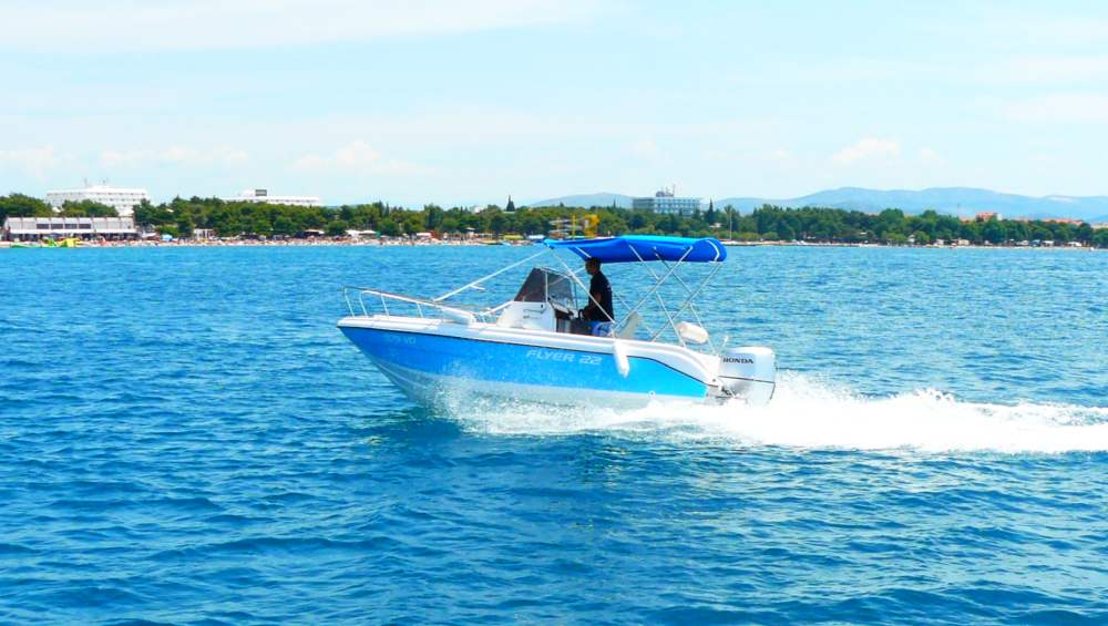• Honda Marine Flyer 22 Sun Deck • Honda Marine fourstroke 150 HP • 6,20 m dužina, 2,50 m širina • 45 mph maksimalna brzina • Registriran za 8 osoba • Kabina sa dva ležaja • Bimini tenda, inox stepenice • Garmin 5-inčna gps navigacija • Priključak ekst. 12V • CD/Usb/Aux/Radio Dnevni najam: već od 190,00 € Tjedni najam : već od 1150,00 €