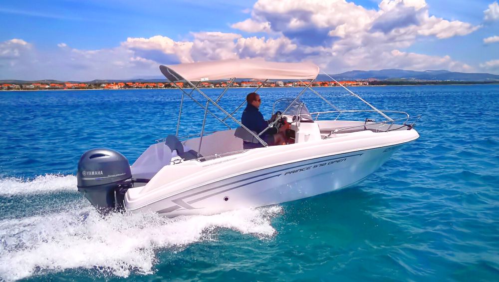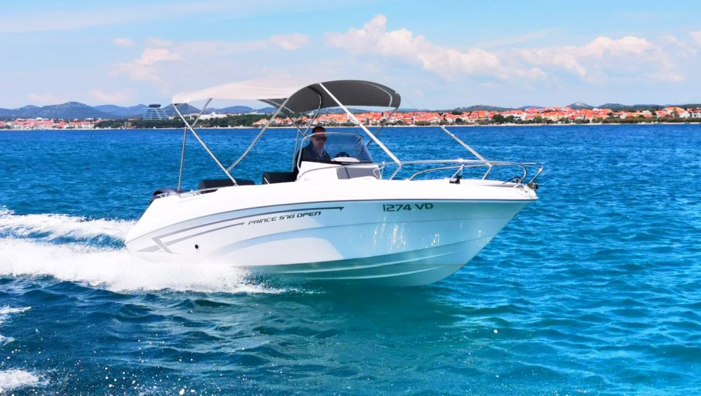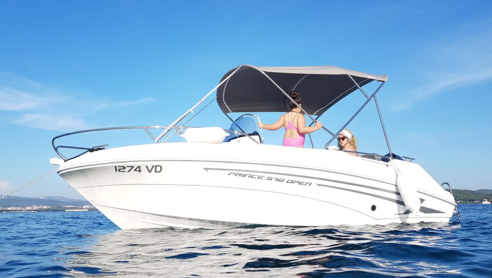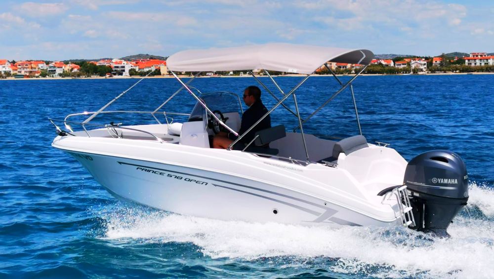 • Prince 570 Open • Yamaha fourstroke 100 HP • 5,70 m dužina, 2,35 m širina • 38 mph maksimalna brzina • Registriran za 7 osoba • Bimini tenda, inox stepenice • Garmin 5-inčna gps navigacija • Priključak ekst. 12V • Usb/Bluetooth/SD/Aux/Radio Dnevni najam: već od 160,00 € Tjedni najam : već od 960,00 €